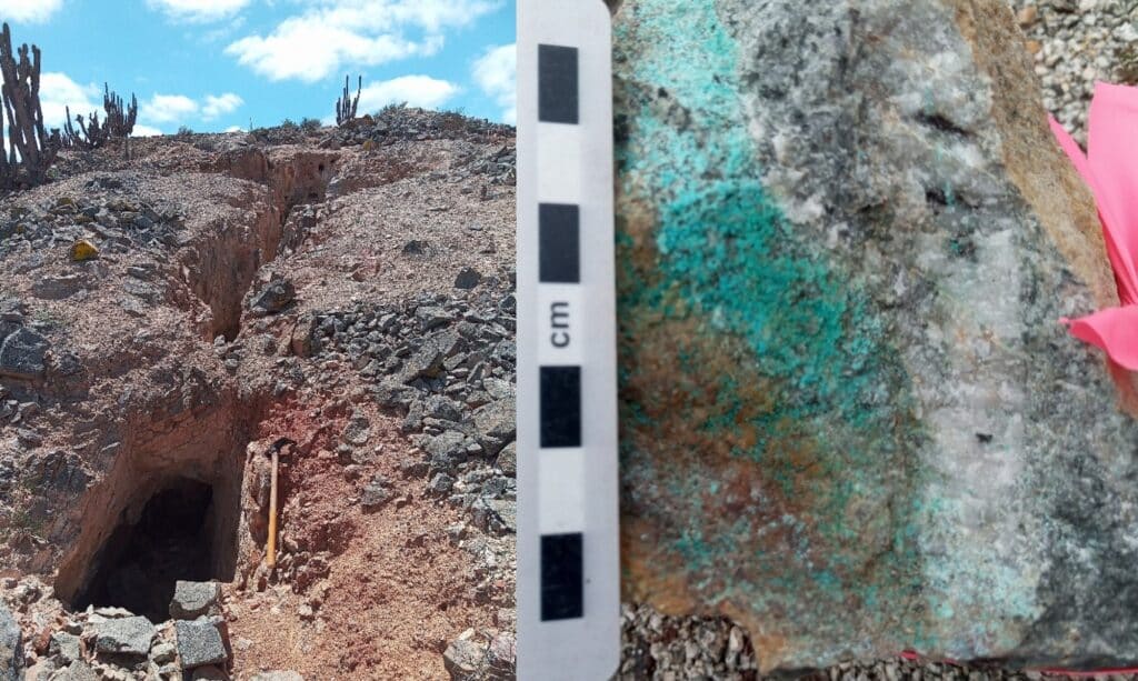 Figure 2. Left: Historical mine workings with kaolinite associated with quartz iron oxide veins | Right: Quartz chrysocolla veins hosted in diorite.